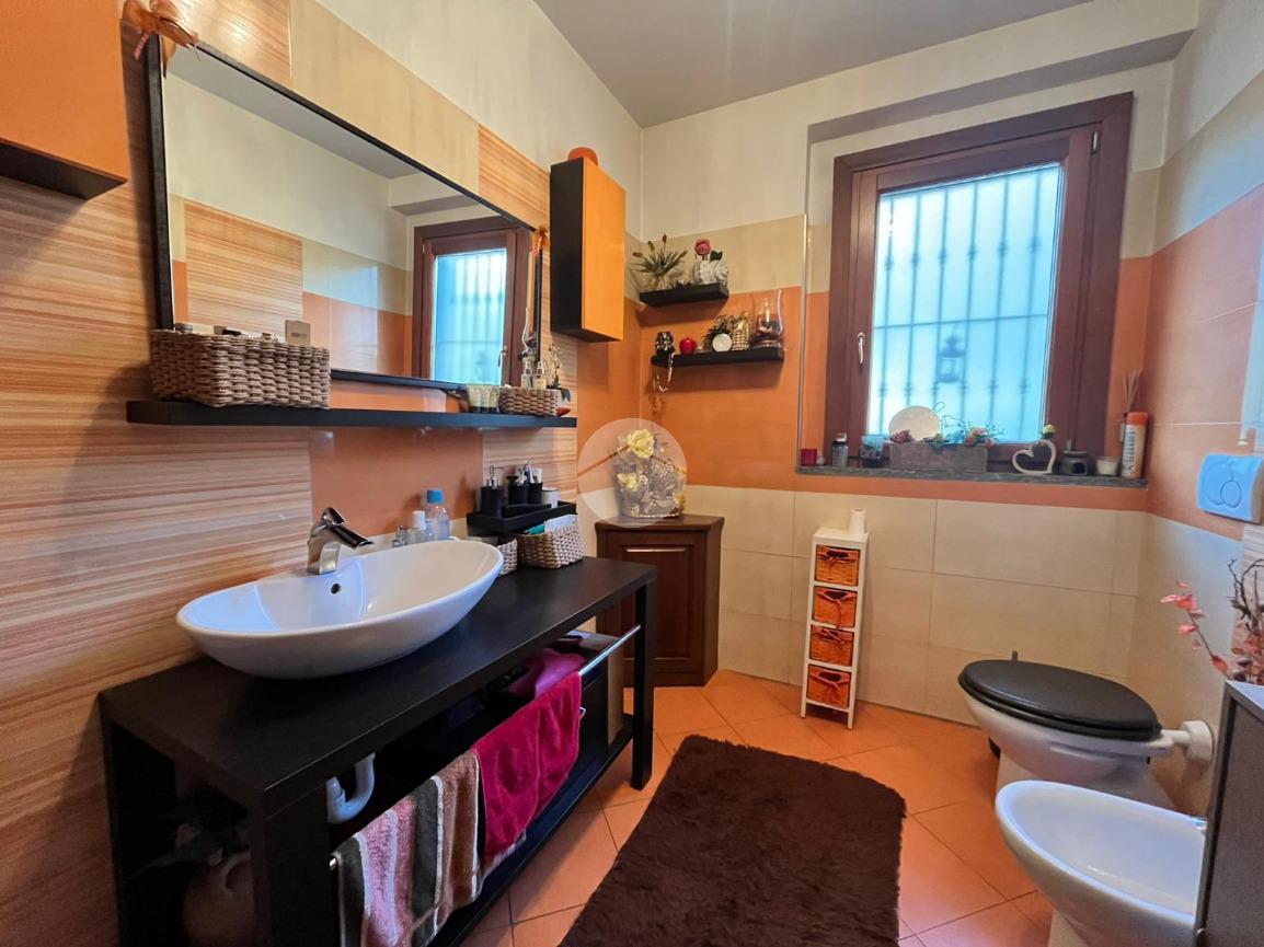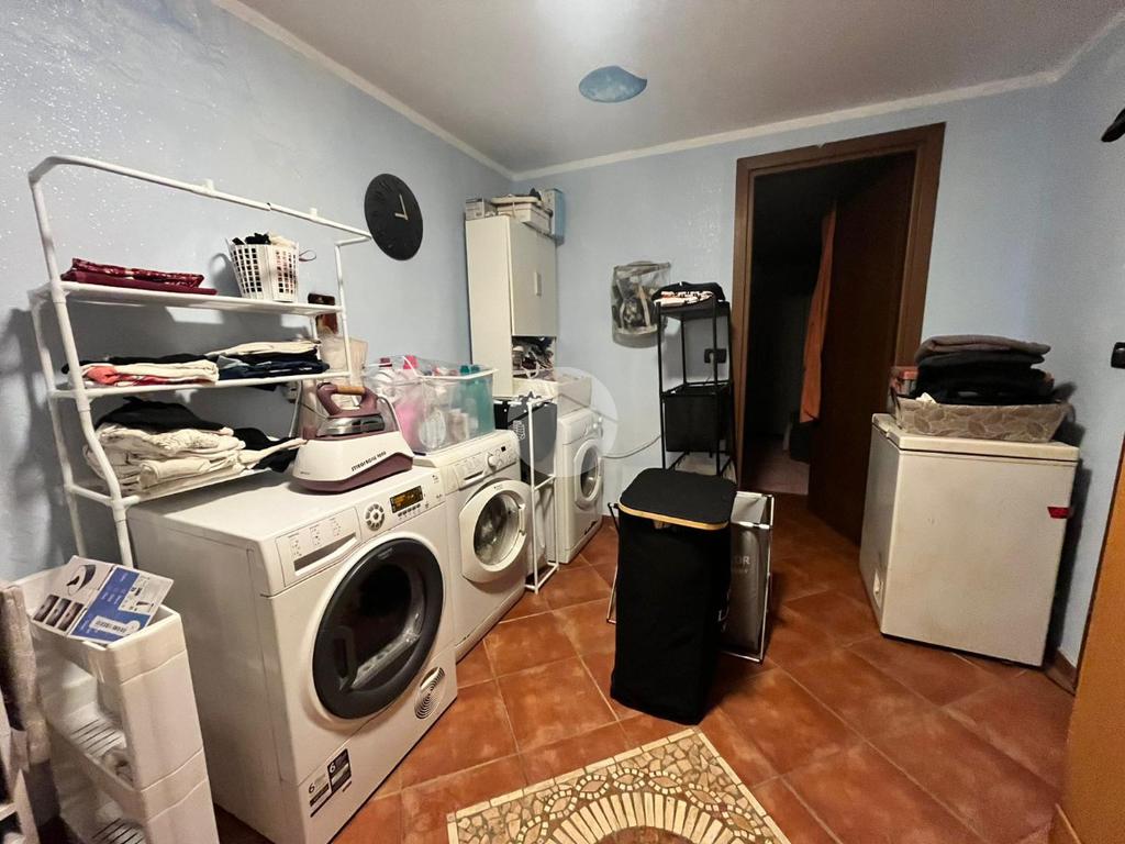 Dalla stessa scala si accede al piano inferiore, dove trovano spazio la lavanderia, un’ulteriore camera attualmente adibita a cabina armadio e una taverna ampia e confortevole, ideale per momenti di convivialità o per creare un ambiente indipendente. Da qui si arriva direttamente al box auto doppio di 50 mq, comodo e facilmente accessibile.