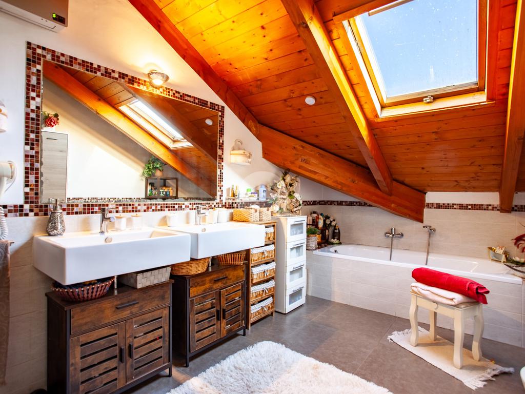 La scala conduce al piano mansardato, completamente rifinito e caratterizzato da ambienti accoglienti. Qui si sviluppano una grande sala da bagno con box doccia e vasca, una stanza utilizzata come cabina armadio, la camera matrimoniale con uno splendido balconcino affacciato sul verde e una cameretta luminosa, perfetta anche come studio.