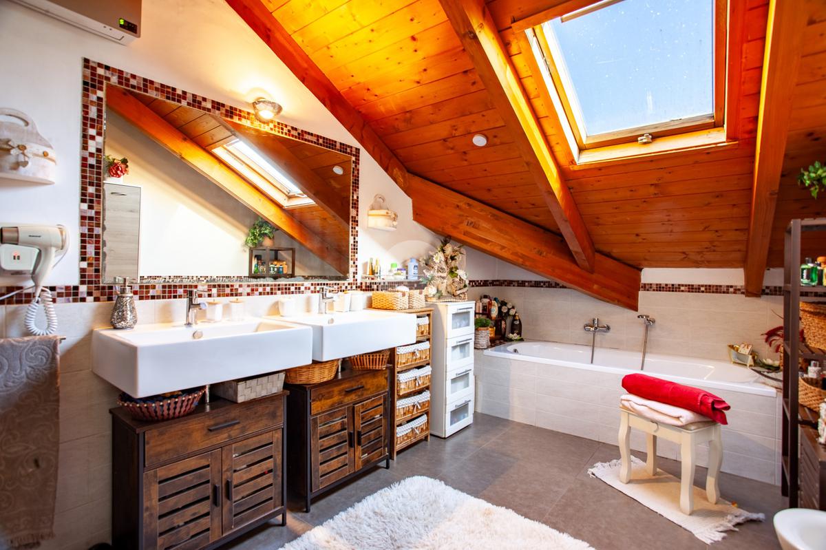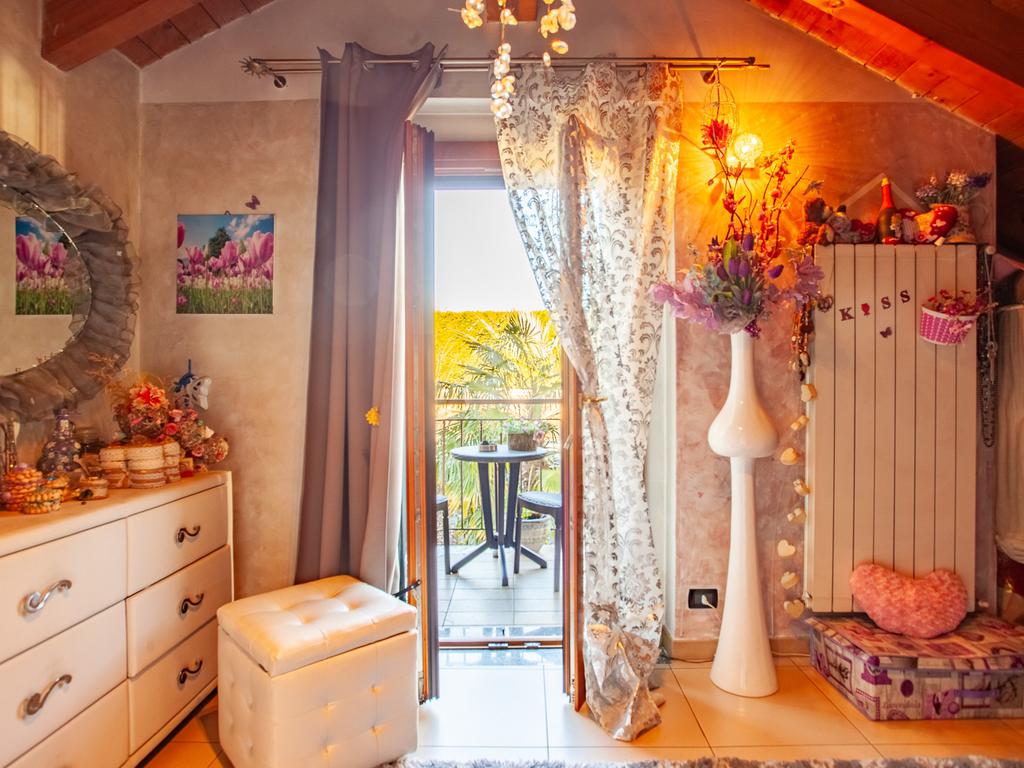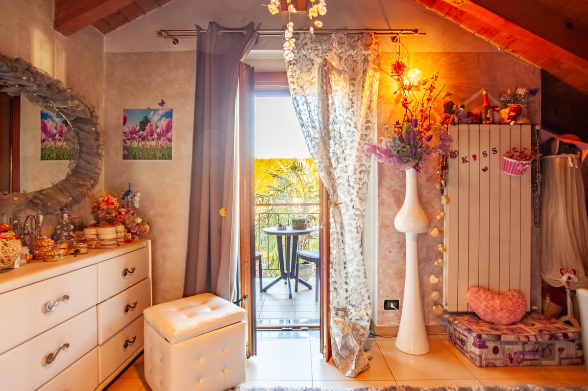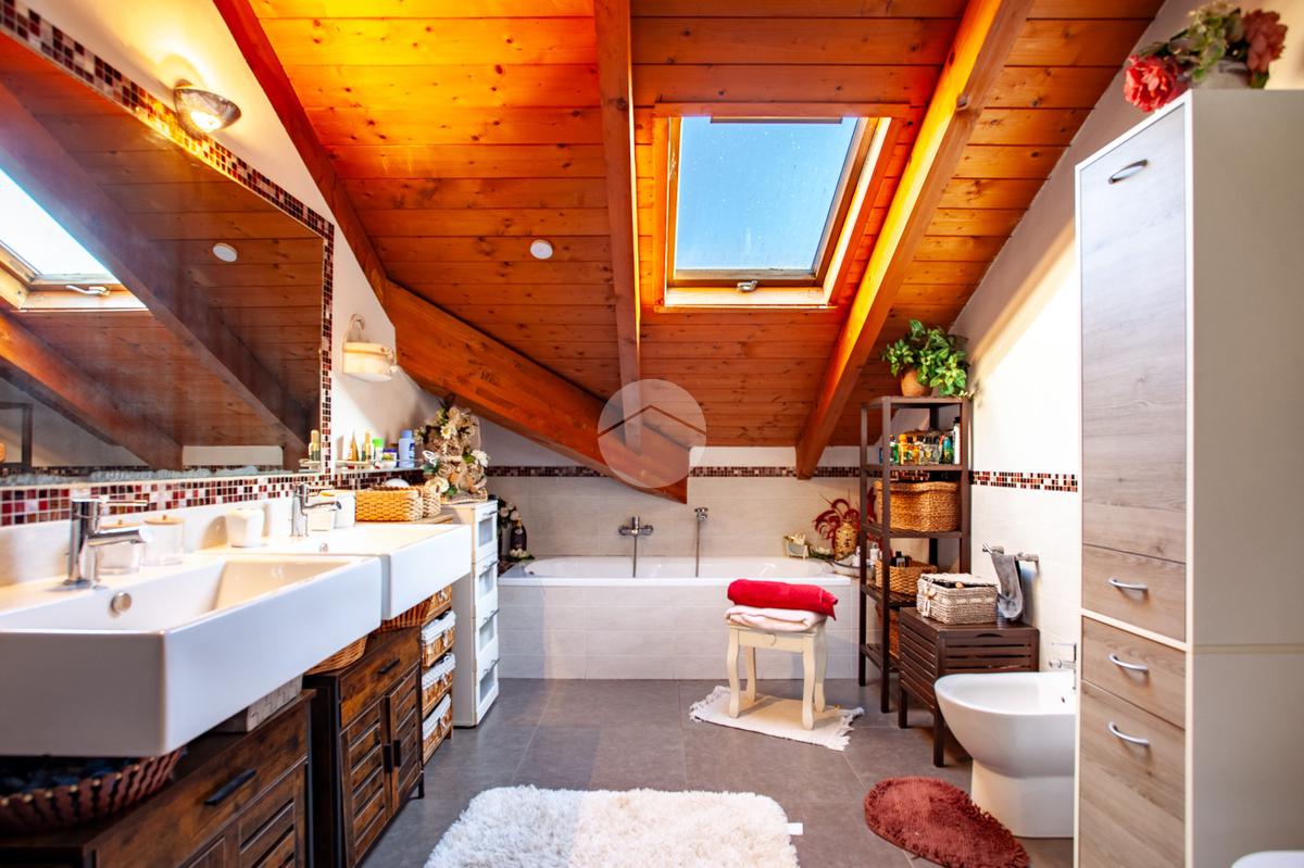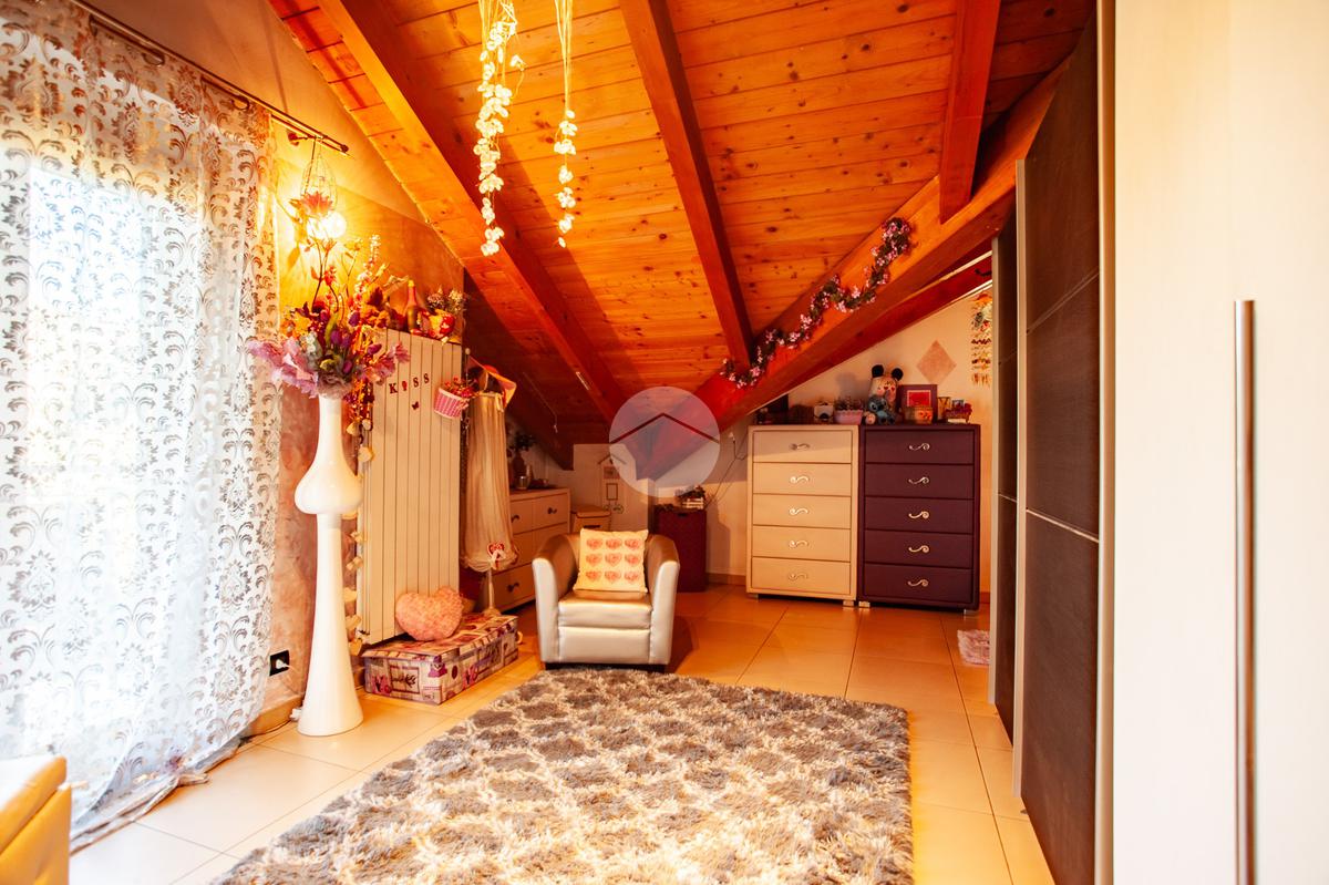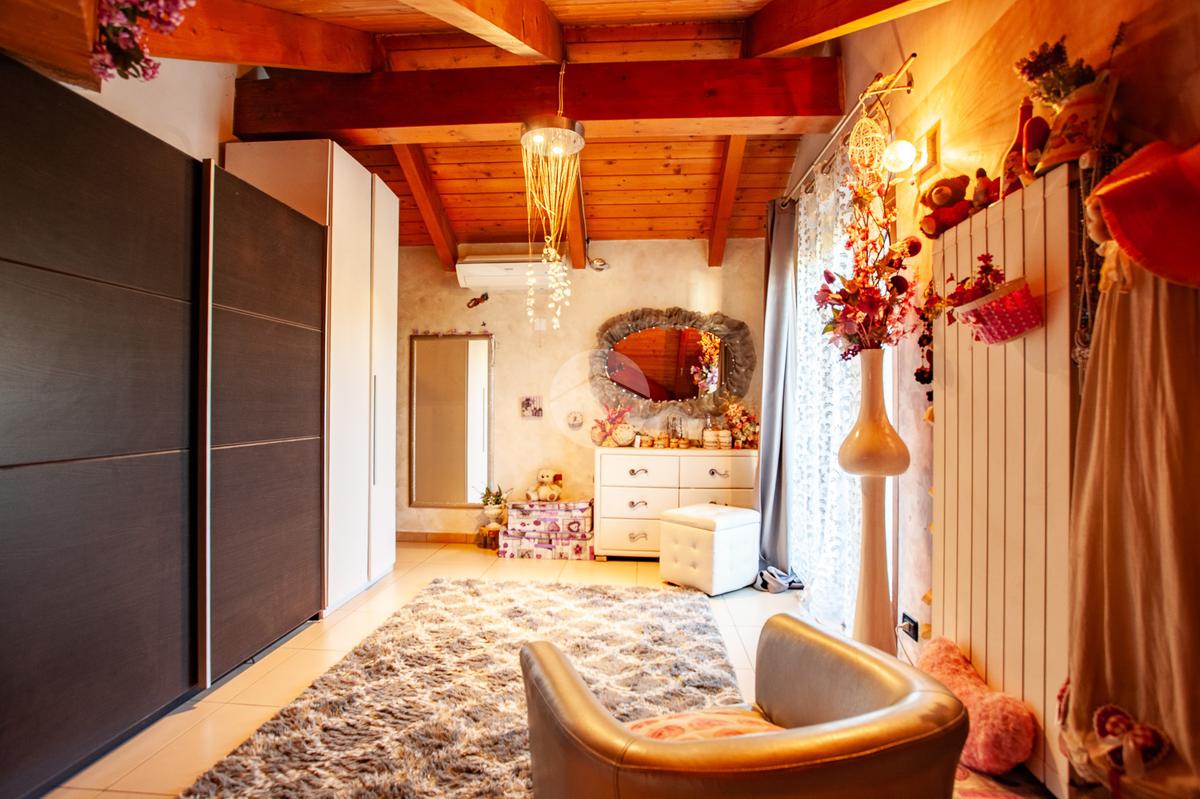 La scala interna accompagna al piano superiore, interamente abitabile, dove si sviluppa la zona notte con due camere da letto, un ulteriore vano versatile adibito a cabina armadio o studio e un elegante bagno dotato sia di vasca sia di box doccia.